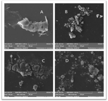 原污水厂二沉池形成的污泥絮体A表面比较光滑絮体呈单个片状;经过高强度破碎之后的絮体B是由许多细小絮体碎片构成,在高强度破碎后细小的絮体碎片简单的聚集在一起,聚合成较大的不稳定的絮体;经过慢速搅拌后破碎的絮体碎片重新絮凝成大的较稳定的絮体C,但重新絮凝形成的絮体不如破碎前稳固,絮体表面存在许多细小凸起不如之前光滑;投加絮凝剂后絮体的再絮凝能力降低,破碎-再絮凝形成的絮体D的结构比较松散,但此时对磷的去除效率最高。