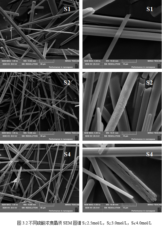 由图3.2可以看出,本体系制得的硫酸钙晶须表面光滑,结晶度较好。低浓度硫酸制得的晶须产品长径比更大且末端更光滑。样品S1S2S4长径比分别为55.5633.3335.71