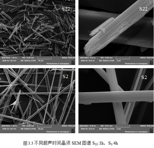 超声时间较长的晶须产品比超声时间较短的晶须产品长径比更大,表面更光滑无裂纹,且结晶度更好。经测量得超声1h的产品的长径比为31.80,超声时间为4h的产品长径比达到35.71