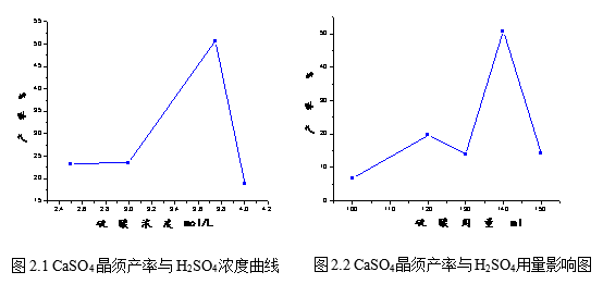 H2SO4浓度对硫酸钙晶须的产率有很大影响,H2SO4浓度过大或过小对产物的产率均不利。在本体系中,最佳H2SO4浓度为3.6mol/L-3.8mol/L。硫酸钙晶须的产率随着硫酸的用量先增大后减小,最佳用量为140mL