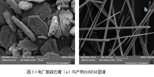 3.1(a)显示电厂脱硫石膏呈不规则的片状,直径在20-40μm。图3.1(b)是以硫酸浓度为3.0mol/L所制得的硫酸钙晶须的SEM,由图可以清楚地观察到以超声法制备的样品形貌为一维晶须,长度均一,且晶须表面非常光滑,长比约为50