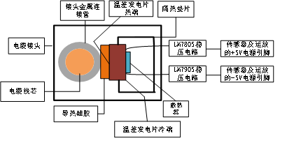 辅助电源为温差发电模块如图2所示。温差发电片装在电缆接头内,用隔热垫片做成盒子,温差发电片的热面位于盒外,用导热硅胶使之贴在电缆绝缘接头内连接管处,冷面处于盒内,引出两线连接传感器及运放电源引脚。