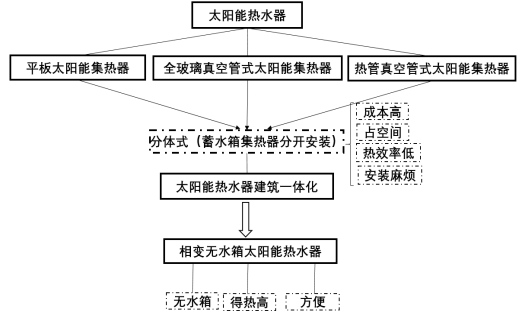 相变无水箱太阳能热水器的研究起步较晚,是针对于传统太阳能热水器缺陷而研发的一款产品,尤其是在太阳能热水器建筑一体化方面的缺陷。目前,国内外学者对相变太阳能热水器的研究主要集中在相变储热装置以及相变储热材料上。按照集热器与储热系统结构是否紧凑可以分为分体式太阳能热水器和一体化太阳能热水器。