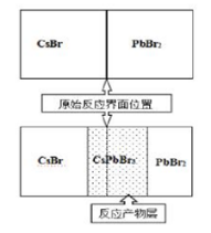 液相合成 CsPbBr3 主要是利用PbBr2 溶液和 CsBr 溶液反应生成 CsPbBr3 粉体。液相反应过程中需要特别注意 PbBr2 溶液和 CsBr 溶液的混合方式。不同混合方式会有不同的产物生成。同时使用溶液反应由于溶剂中本身杂质的存在,会对合成的粉体中引入新的杂质,不利于得到性能优良晶体的。由于 CsPbBr3 会有一部分溶于溶剂中,会在洗涤过程中随溶剂流失。因此对原材料造成了一定的浪费,同时 CsPbBr3 产量会降低。由于溶液合成法的以上不足之处,所以采用固相反应生成CsPbBr3更为合适。PbBr2 和 CsBr 反应形成 CsPbBr3 过程如图二所示。