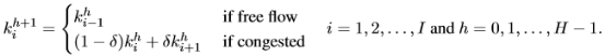 其中δ= w / ,w是后向冲击波速度。 方程(4)假设每个元胞长度相等和同样的基本图,在路段中没有车辆的驶入驶出(即没有匝道)。