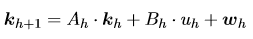 向量 是在时间步h的状态向量,矩阵Ah和Bh是时变的,它们在时间步h处取决于模式m。在自由流模式中m = 1,在拥塞模式中m = 2。wh表示状态方程的误差(由于错误或遗漏的计数引起,例如车辆变道)。输入uh是标量,并且与在计算域的边界处获得的测量相关(用于分别计算自由流或拥塞模式下的第一或最后一个元胞的密度)。事实上,如果整个路段在自由流或拥挤模式下: