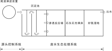 源头控制系统的废水进入该系统。该系统包括沉淀池、渗透反应生态墙、封闭式石灰石充填床和好氧湿地等单元。