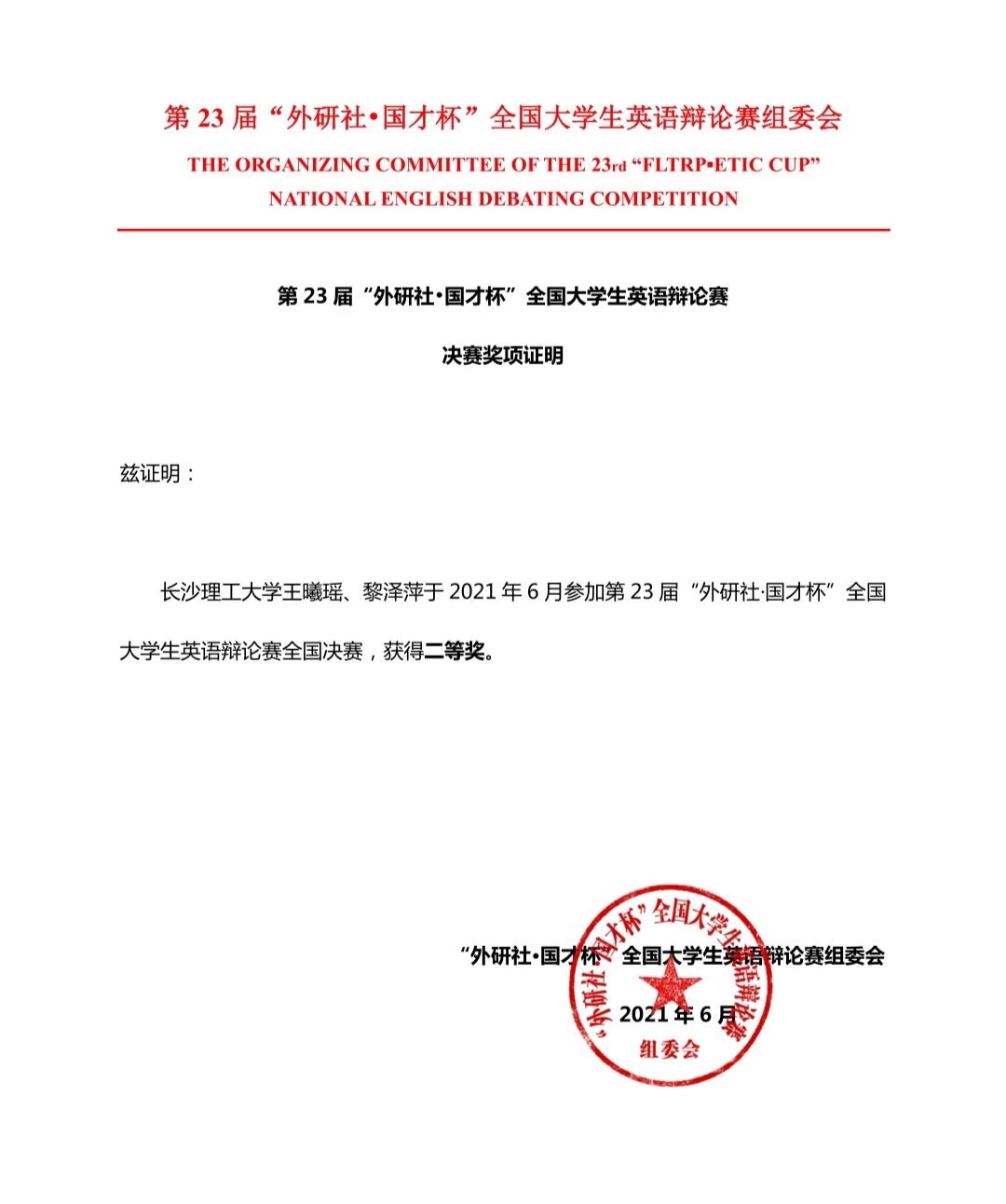 近日,第23届“外研社·国才杯”全国大学生英语辩论赛圆满结束。威廉体育2018级英语专业本科生王曦瑶、2019级翻译专业本科生黎泽萍,在外国语学院王浩萍老师的悉心指导下,以过硬的专业素养、扎实的思辨能力,荣获该项赛事全国二等奖。