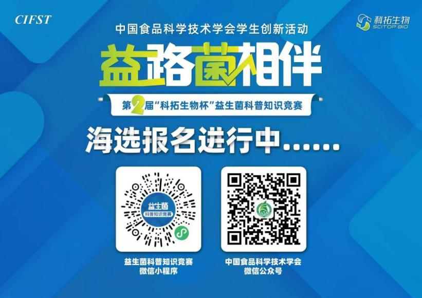 随着益生菌的健康作用受到全社会的广泛关注,益生菌科研与产业也迎来快速发展的机遇期。为科学普及益生菌知识,激发在校大学生对益生菌的学习热情,促进师生之间的人文交流,助力院校益生菌的相关专业教学,助力更多青年人才成长,为益生菌产业的未来储备力量。2022年,中国食品科学技术学会与北京科拓恒通生物技术股份有限公司,共同举办中国食品科学技术学会第二届“科拓生物杯”益生菌科普知识竞赛。