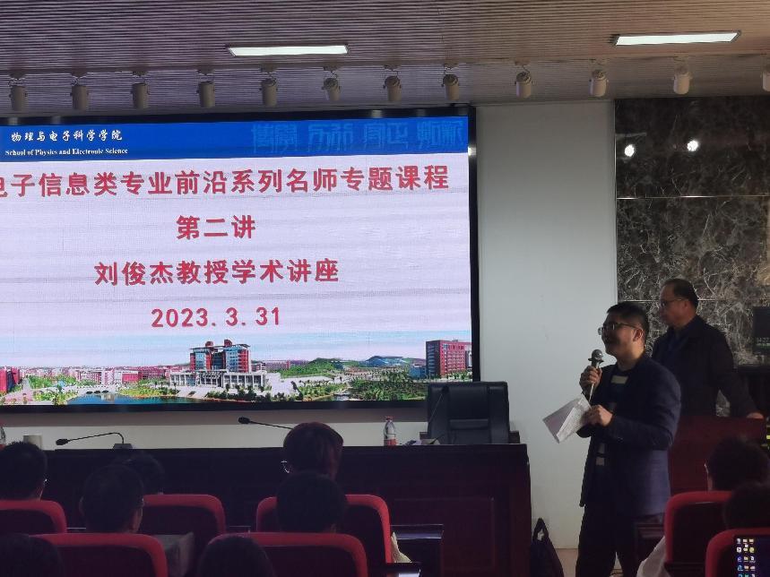 3月31日下午,教育部长江学者、教育部海外名师、北方民族大学刘俊杰教授应邀作为我院电子信息类专业前沿系列名师专题课的第二讲主讲人。刘教授在理科楼B-413为2022级电子系的同学们讲授了一堂以“集成电路的现况与集成电路的可靠性”为主题的专题课程。学院副院长(主持工作)张卫兵、副院长范志强、电子系主任邹望辉与电子系的师生们共计120余人一起聆听了专题课程。