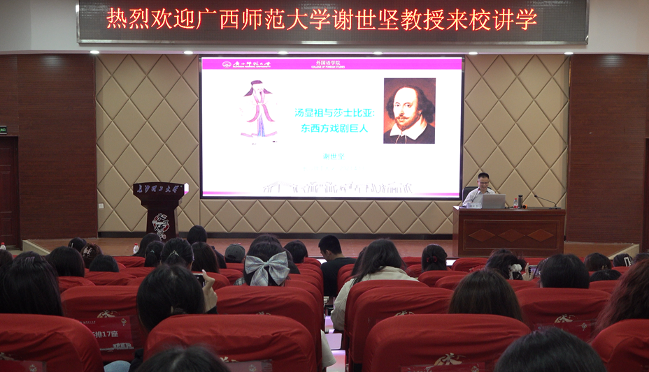讲座开始时,谢世坚院长用幽默谦虚的语调简单介绍了他在国家社科基金项目中取得的成就,引出本次讲座的主题。谢院长对世界文化史坐标中16、17世纪之交的中国明代晚期与英国伊丽莎白时代分别出现的文学巨匠汤显祖和莎士比亚进行分析比较,一方面是汤显祖戏剧对中国传统戏剧尤其是元明戏曲的历史传承及其伟大成就,另一方面是文艺复兴的英国戏剧与莎士比亚戏剧的伟大成就。