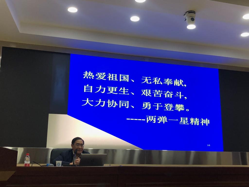讲座中,郭柏灵院士向师生们介绍了我国“两弹一星”事业的发展史、我国核武器的研制背景、发展历程以及“两弹一星”事业取得重大突破的成功经验。接着,郭院士结合自身参与“两弹”的研究经历,用大量感人的事例和图片资料,向大家介绍了“两弹一星”功勋奖章获得者钱三强、彭桓武、郭永怀、朱光亚、周光召等老一辈科学家在艰苦的条件下,为“两弹一星”的研制成功作出突出贡献的感人事迹,深刻阐释了热爱祖国、无私奉献,自力更生、艰苦奋斗,大力协同、勇于攀登的“两弹一星”精神。