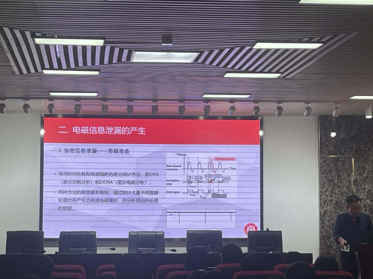 茅剑教授是从信息安全关乎国家安全,电磁信息安全是信息安全的重要课题,电磁信息安全威胁以及国内外研究现状四个方面出发,层层递进引出信息安全的意义,随即向同学们介绍了电磁信息泄露产生的机理和电磁信息泄露的类型,点明同学们的信息或许在不经意间就已泄露。紧接着,茅剑教授以信息泄露检测为题,简要概括了多种检测方法。最后茅剑老师提到电磁信息泄露不容小觑,向同学阐述了电磁信息泄露防护各式各样的手段。茅剑教授激情的讲解与热情的互动获得在座师生一致好评。