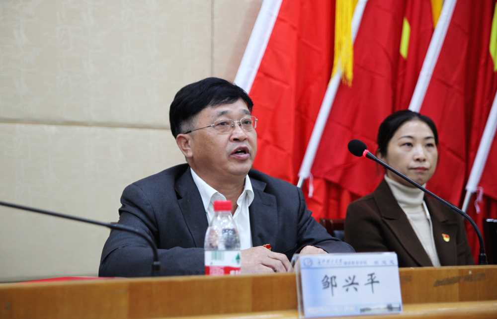 邹兴平院长发表讲话,他指出,此次会议是一场弘扬主旋律的换届党员大会,希望各支部会后组织党员认真学习谈校长重要讲话和何纯芳同志的工作报告,不断提高政治素养,提升政治格局,团结进取,勇于担当,切实推动学院高质量发展。