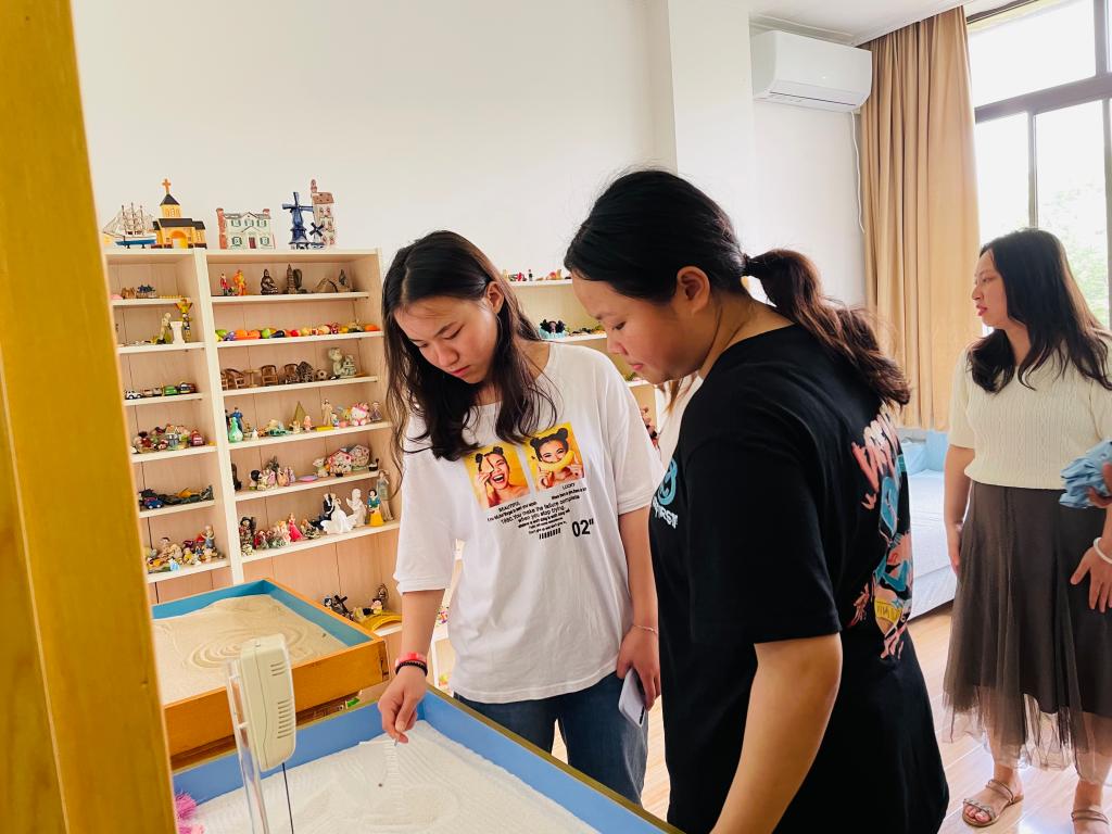 金盆岭咨询室负责人王鑫担任讲解员,带领师生全面了解心理咨询室的职能、心理健康教育的特色,并有序参观体验了个体咨询室、团体心理辅导室、心理测评室、沙盘游戏室等功能室。通过讲解与实地参观,心理咨询预约的基本流程、咨询师如何协助学生解决心理问题等有了更深了解,纠正了“有问题才来咨询”的认识误区,有助于在全校师生中形成关心心理健康的浓厚氛围。(文/图 彭莎莎/审 方碧波)