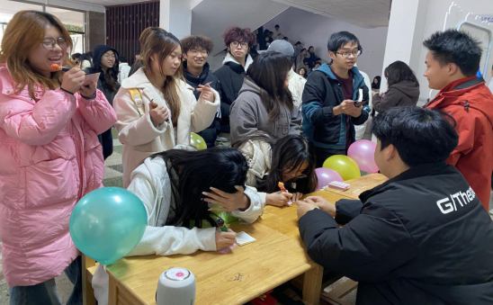活动现场精心设置了三个紧密相连、趣味十足的打卡站点,宛如一条温暖的心灵之旅,引领同学们逐步释放压力、感受善意。首站是“情绪树洞投递站”,这里静谧而充满力量,是一个能包容所有情绪的温暖怀抱。同学们纷纷停下脚步,认真地在纸条上写下自己内心深处的烦恼与困惑,或许是考试带来的焦虑,或许是人际交往中的困扰,又或许是对未来的迷茫与担忧。随后,他们将写满心事的纸条轻轻投入树洞信箱,完成了一次无声却畅快的情绪宣泄。这一刻,那些压抑在心底的情绪仿佛找到了一个安全的出口,得以释放。
