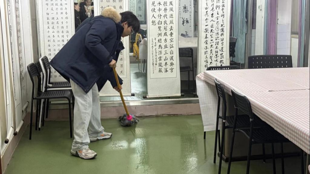 活动尾声,党员们开展了环境美化行动。他们认真清扫院落、整理图书角,将老人们的手工艺品精心布置在展示区,在书画室,几位具有艺术特长的党员还与老人们共同创作书法作品,墨香四溢中架起代际沟通的桥梁,让整个福利院焕发出新的生机。