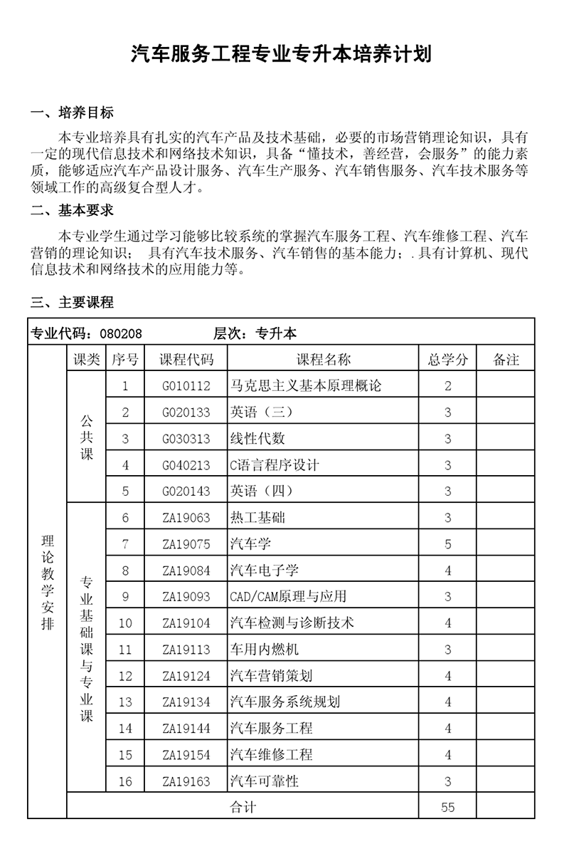 本科培养计划-专业代码:080208 汽车服务工程专业