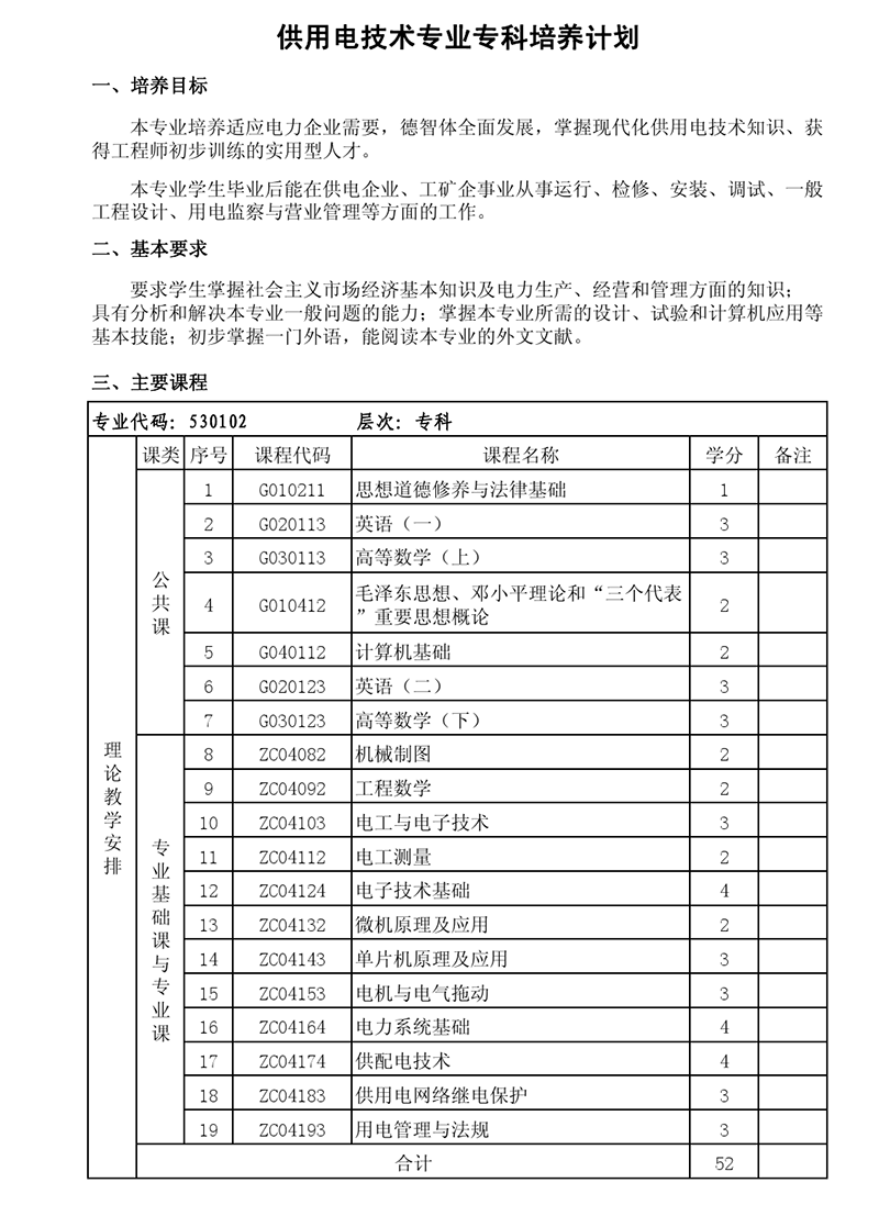 专科培养计划-专业代码:530102 供用电技术专业