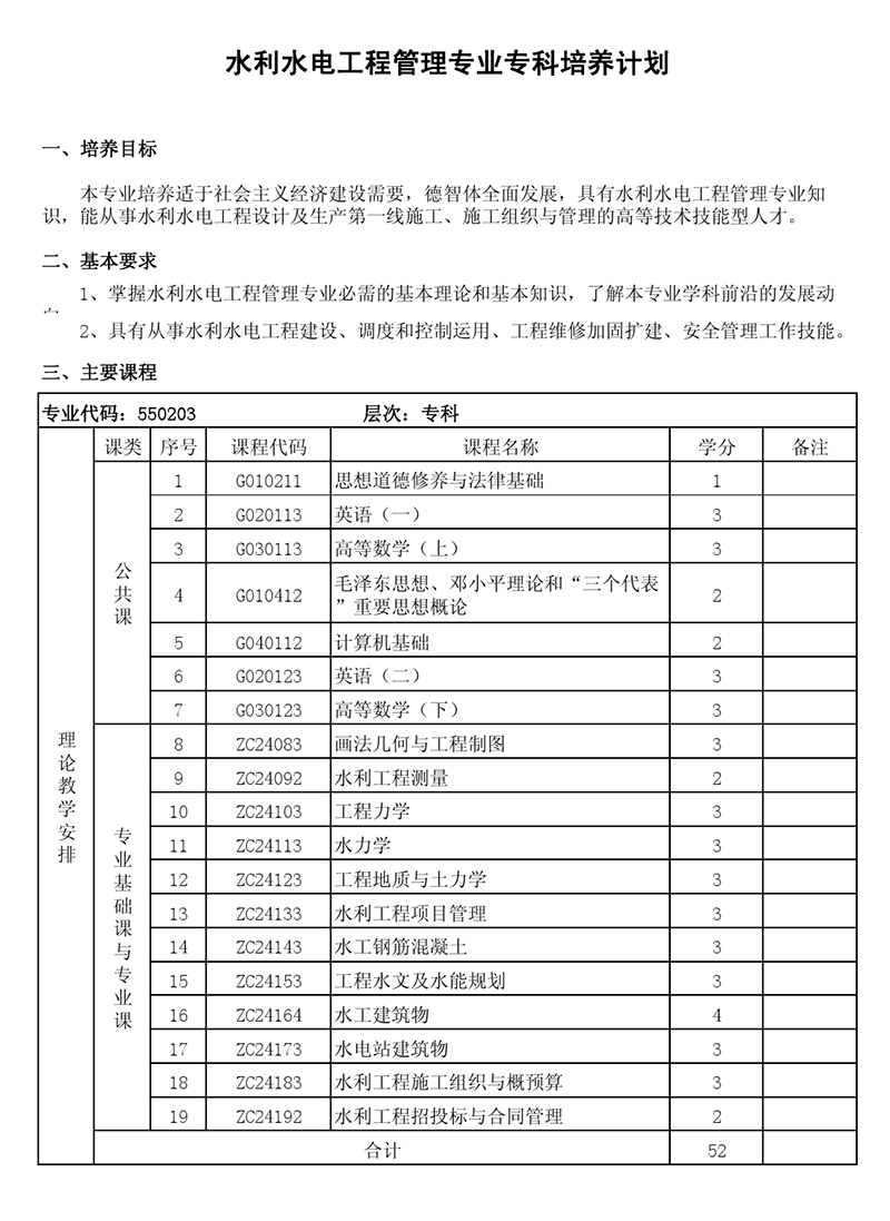专科培养计划-专业代码:550203 水利水电工程管理专业