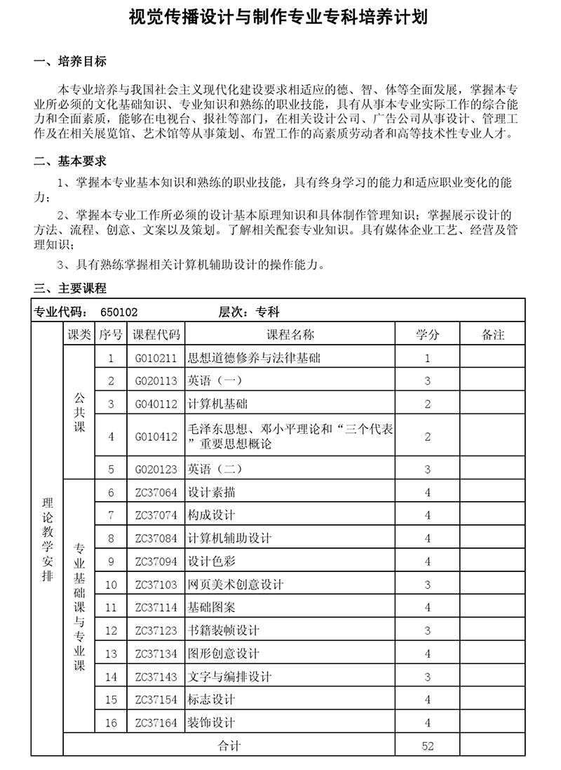 专科培养计划-专业代码:650102 视觉传播设计与制作专业