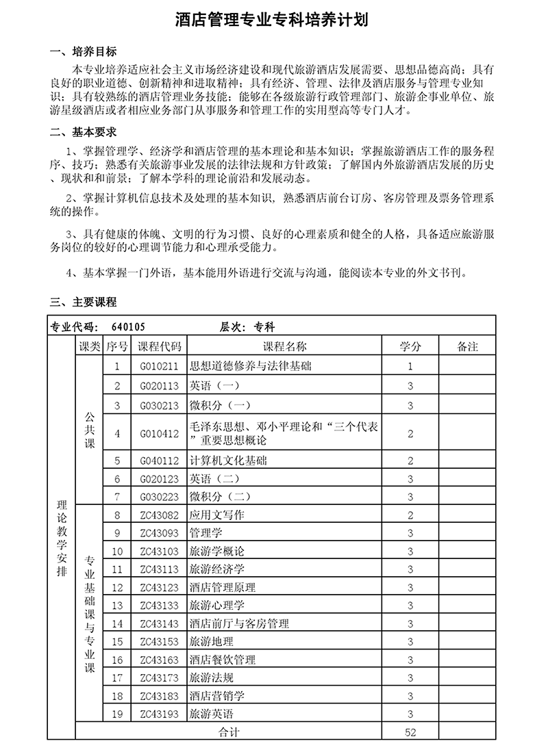 专科培养计划-专业代码:640105 酒店管理专业