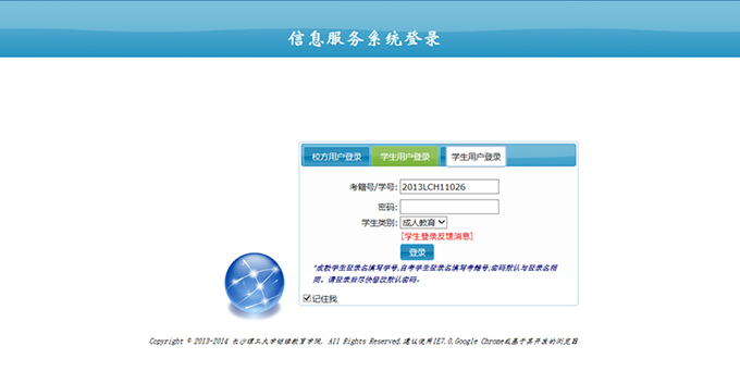 (威廉体育williamhill继续教育学院信息服务平台),选择”学生用户登录”,用户名输入自己的考籍号(自考学生)或学号(成教学生),默认密码与用户名相同,并且在“学生类别”选择自己正确的类别(成人教育,湖南自考,海南自考,社会自考等),登录后请尽快修改自己的密码;