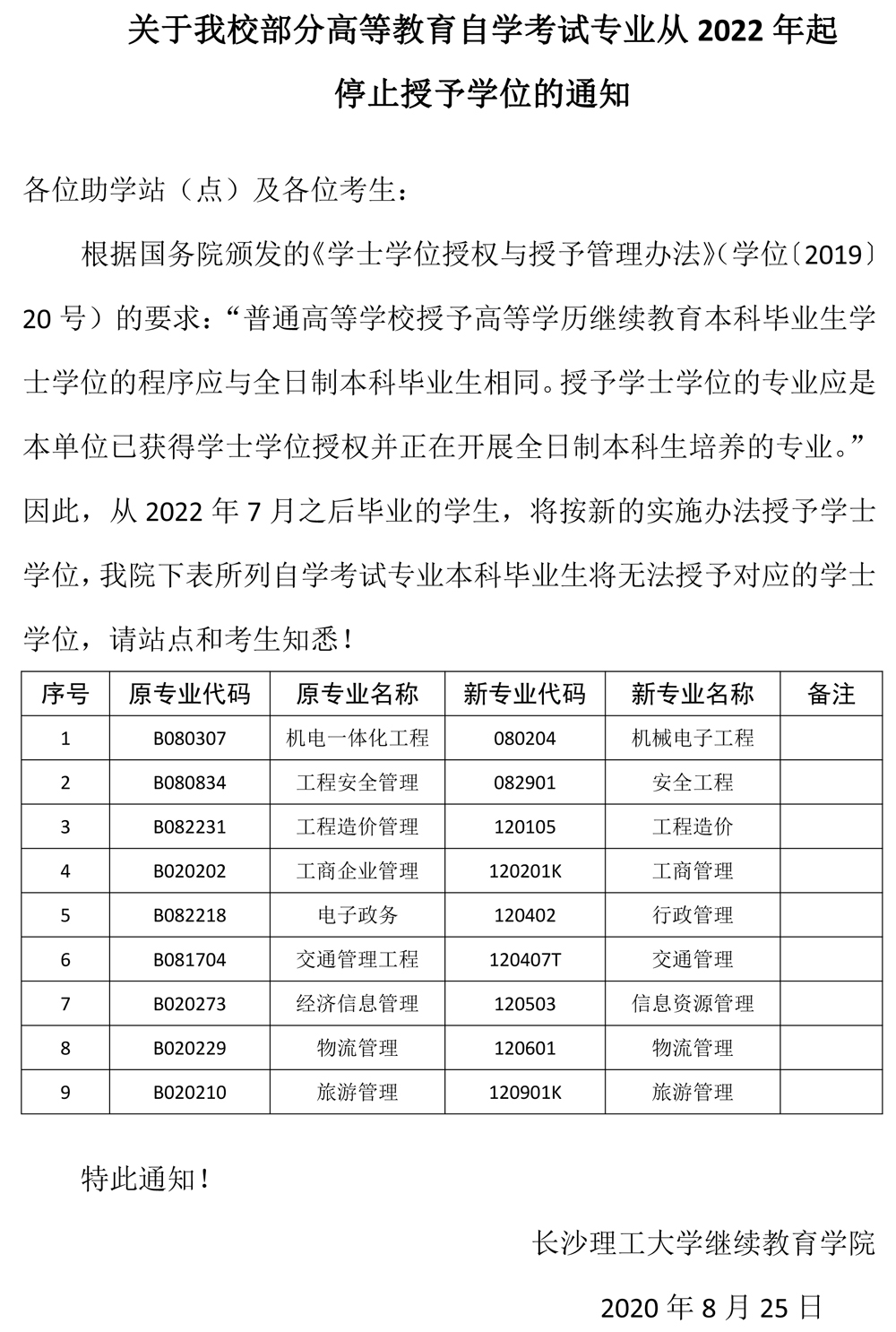 关于威廉体育部分高等教育自学考试专业从2022年起停止授予学位的通知