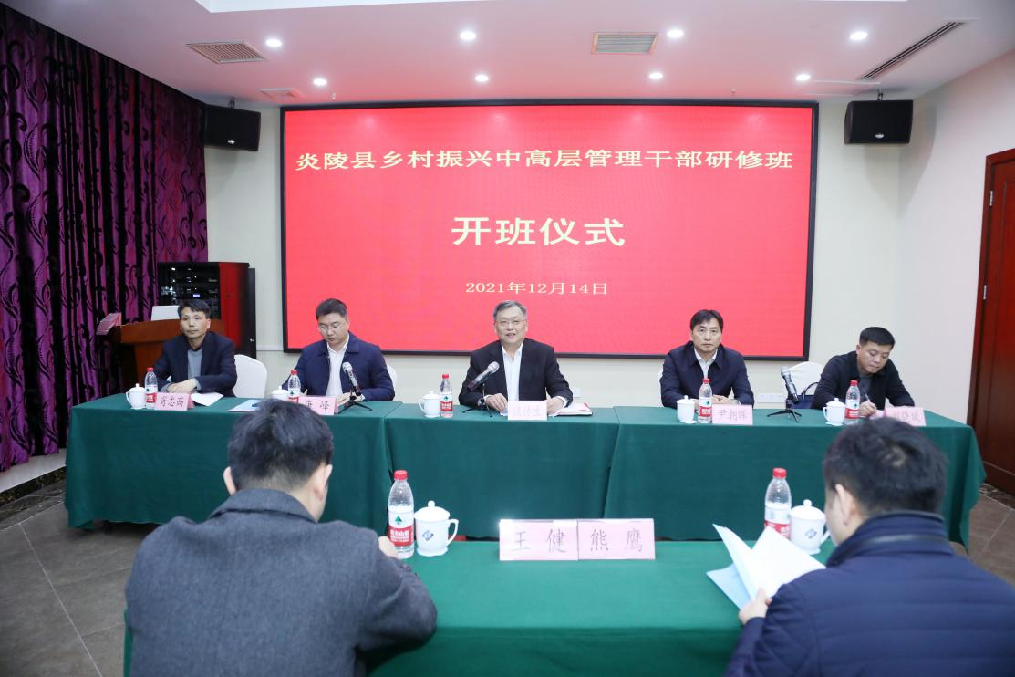 2021年12月14日,威廉体育承办的“炎陵县乡村振兴中高层管理干部研修班”,在威廉体育国际学术交流中心举行开班仪式。副校长谈传生出席开班仪式并致辞。炎陵县委书记尹朝晖,县委组织部长唐峰,县委常委、副县长刘晓斌,副县长肖志高,继续教育学院、建筑学院、设计艺术学院、成果转化中心等学院、部门负责人,及全体学员参加开班仪式。开班仪式由炎陵县委组织部长唐峰主持。