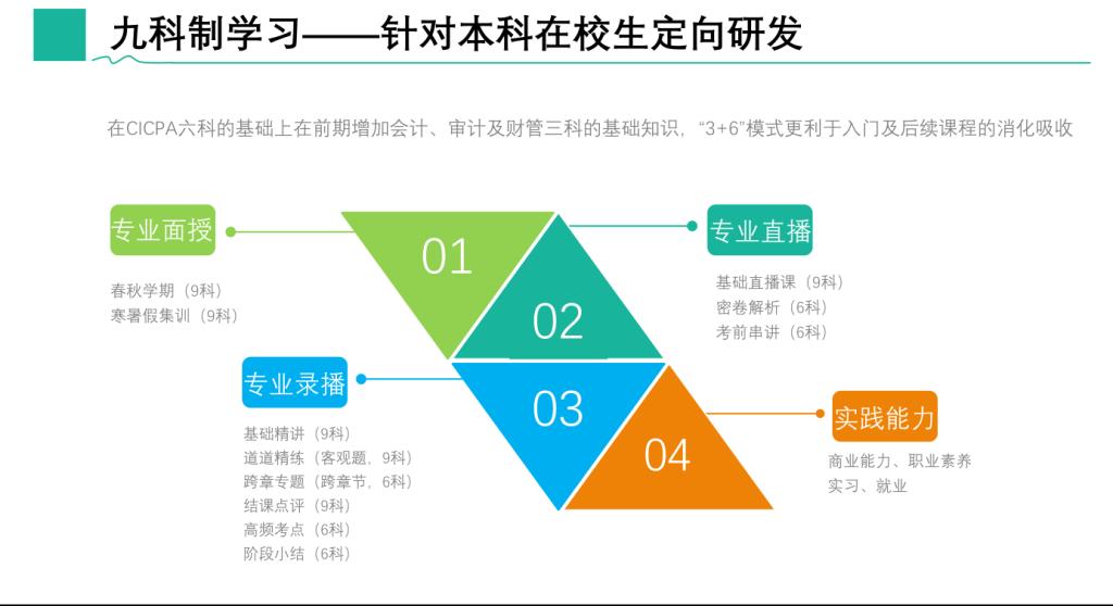 本培养方案针对本科低年级大学生量身定制,从财务基础知识入门到CPA专业知识全面学习,由浅入深,结合职业素养实训实习就业全方位培养体系计划,即在大学学习了CPA专业知识,也同时提升了财务实操的专业能力,提供实习就业指导,领先一步提前了解、适应职场。
