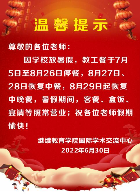 因学校放暑假,教工餐于7月5日至8月26日停餐,8月27日、28日恢复中餐,8月29日起恢复中、晚餐。暑假期间客餐、盒饭、宴请等照常营业;祝各位老师假期愉快!