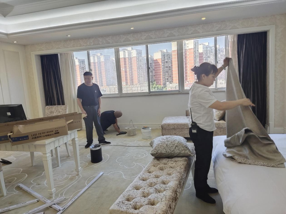 1、总经理谢治强带领管理人员对即将入住的一百余间房间进行全面检查,包括房间设施、照明、墙面、地面、淋浴间等,楼层班组对房间进行精细洒扫、抹尘、消杀,并联合维保部按要求将原来的房型布置成三人间,添加床位,增补物品,对房间设施设备进行修护,有条不紊地进行入住前的准备工作。