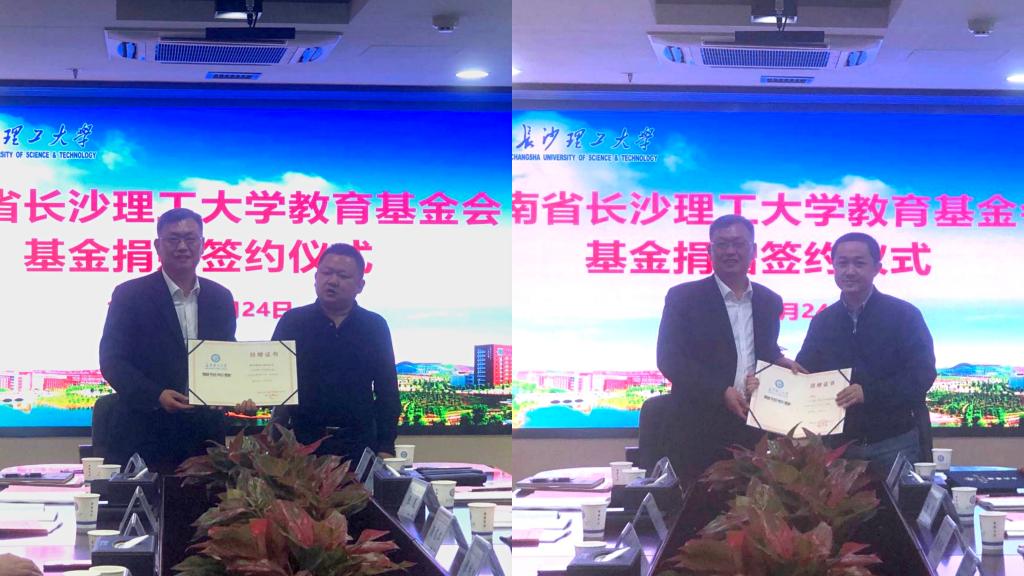 会上,还举行了两项捐赠签约仪式。湖南潭泰建设工程公司董事长、01 级校友孙晓峰向基金会捐赠100万元,海南福山福湖置业有限公司总经理、97级校友李道洪捐赠价值100万元校园文化建设项目,谈传生代表教育基金会与两位校友签署捐赠协议。至此,2021年教育基金会签订捐赠协议价值1035万元,创近五年新高。