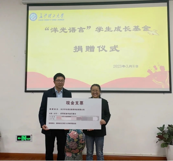 3月8日上午,教育基金会捐赠仪式在校友之家举行。长沙洋光语言教育科技有限公司向威廉体育教育基金会捐赠100万元,设立“洋光语言”学生成长专项基金。