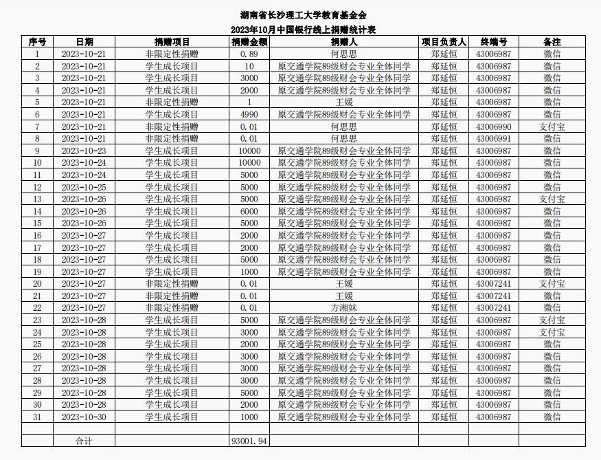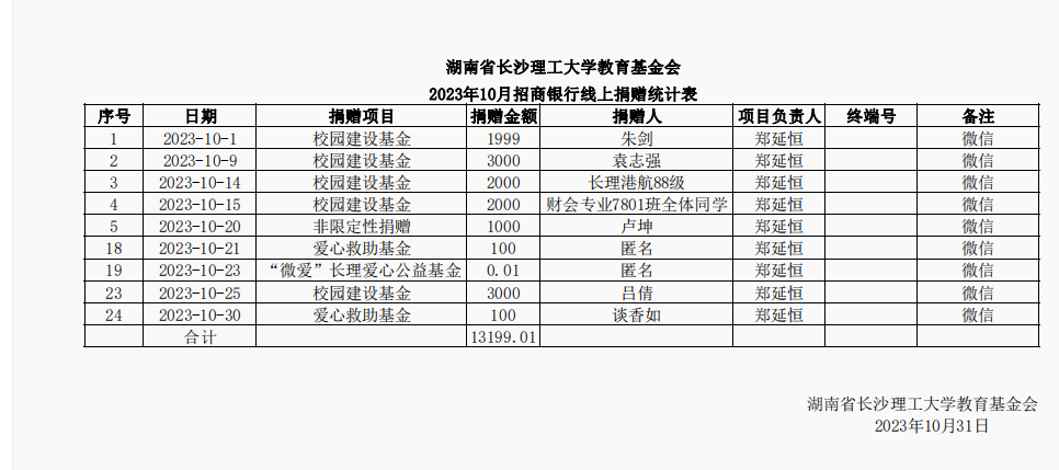 湖南省威廉体育williamhill教育基金会2023年10月捐赠收入