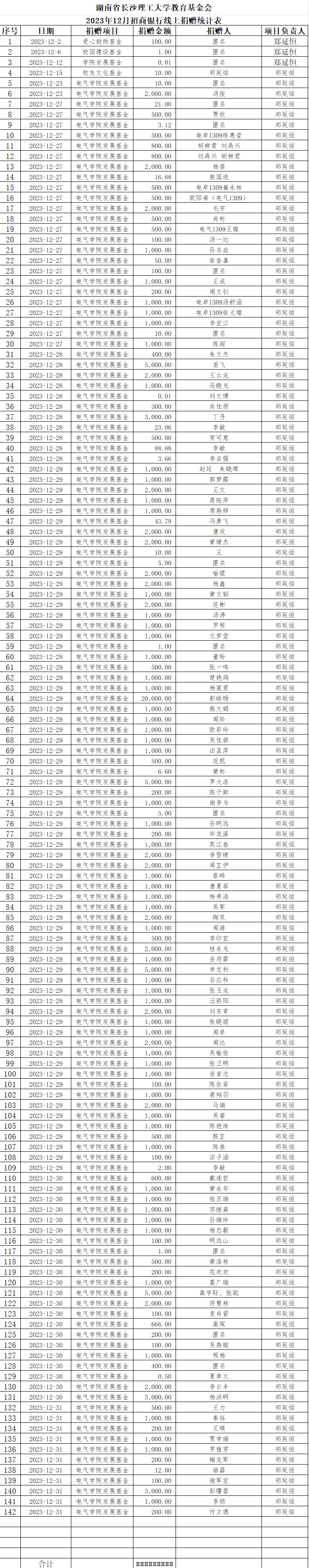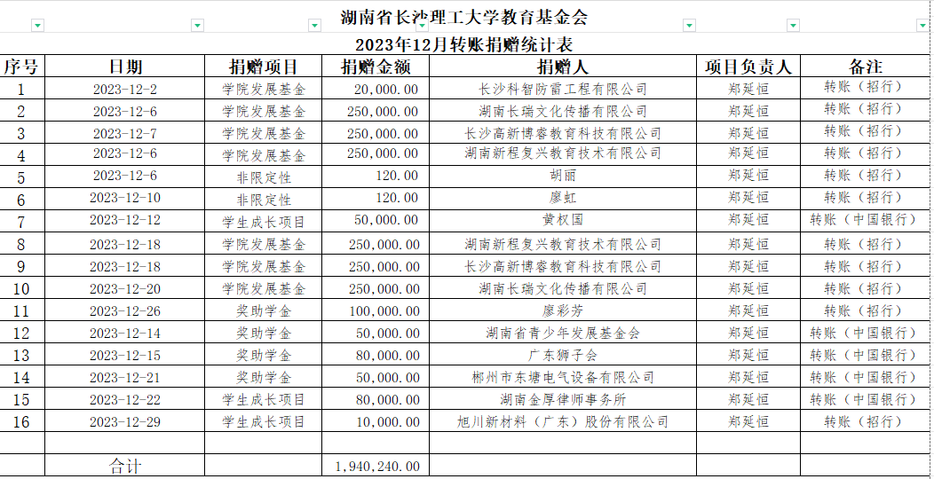 湖南省威廉体育williamhill教育基金会2023年12月捐赠收入表
