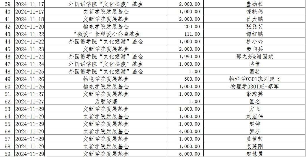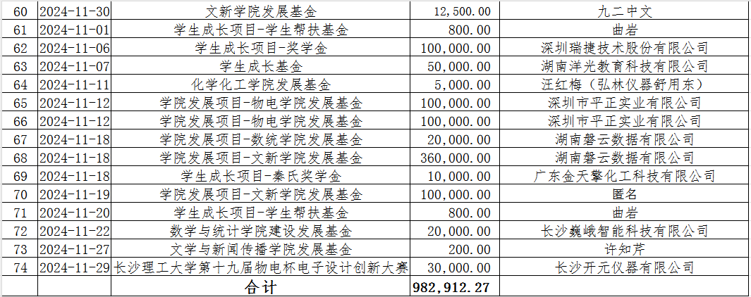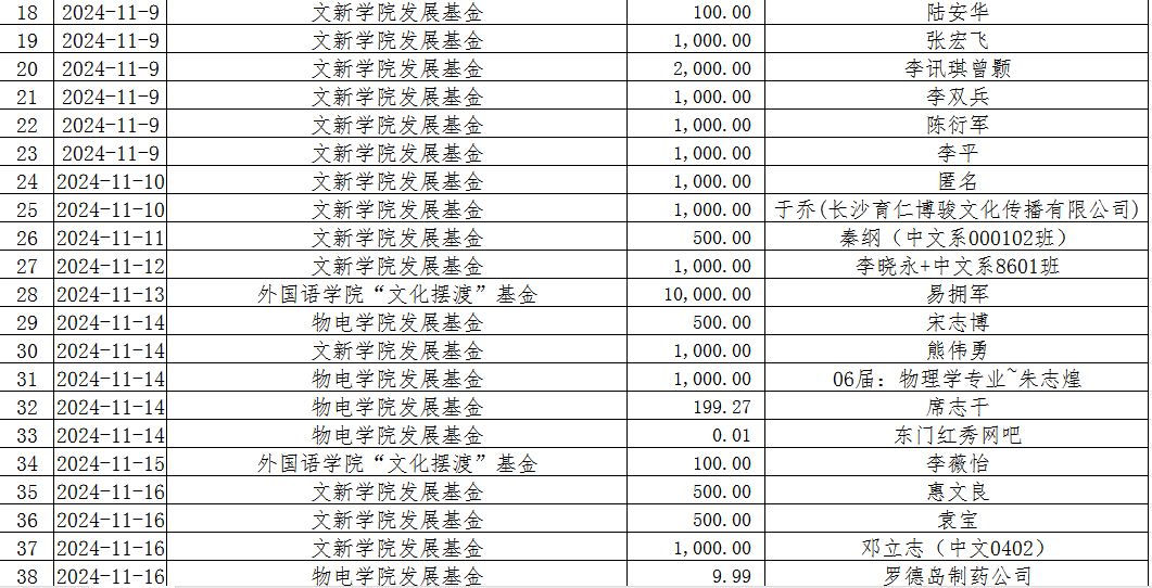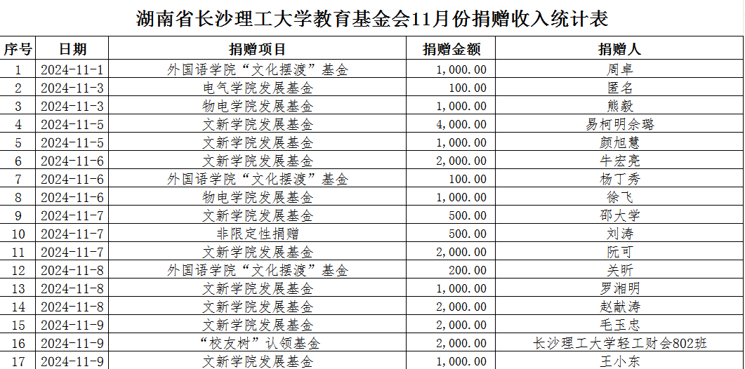 湖南省威廉体育williamhill教育基金会2024年11月捐赠收入表