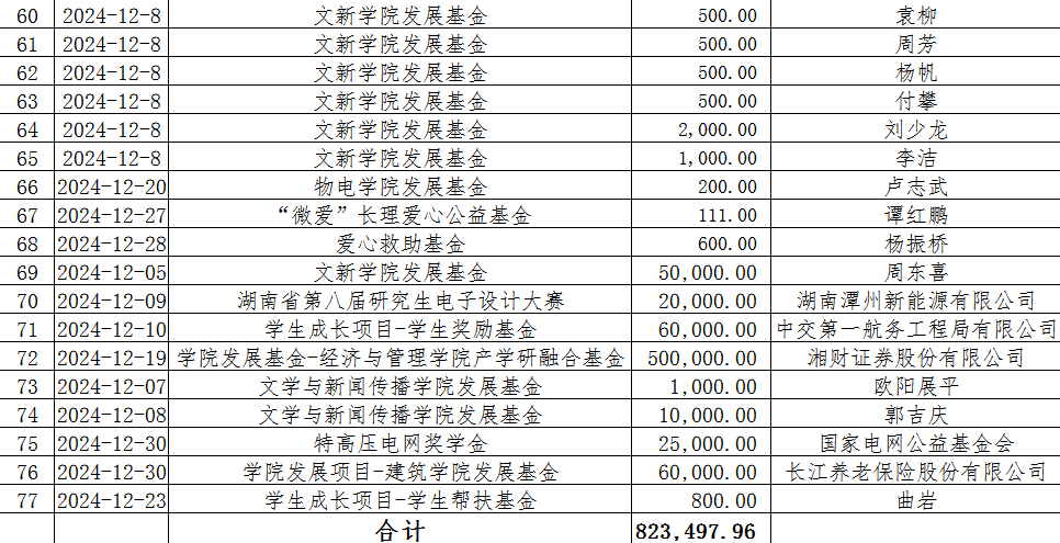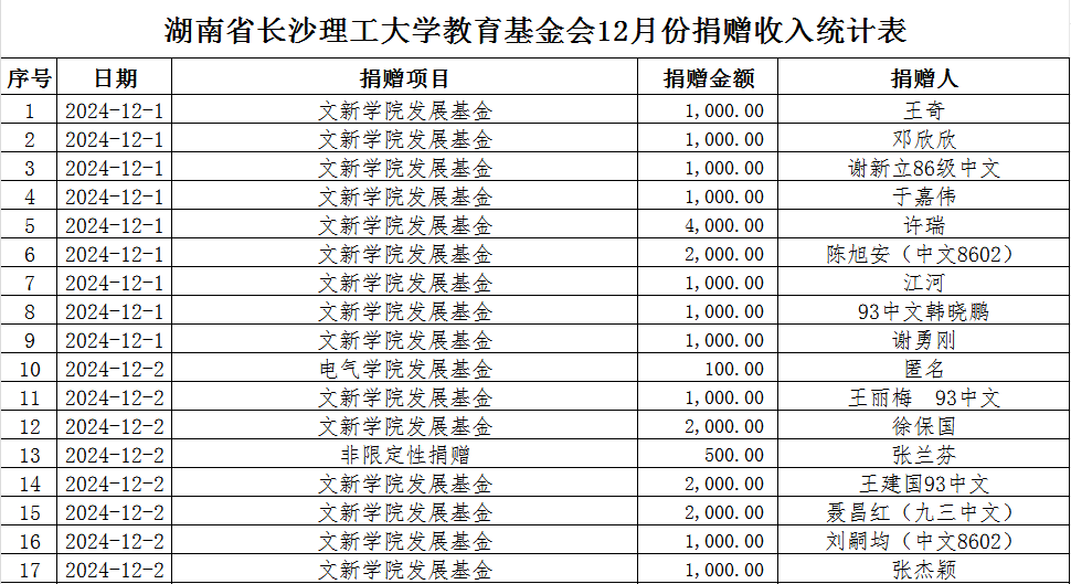 湖南省威廉体育williamhill教育基金会2024年12月捐赠收入表