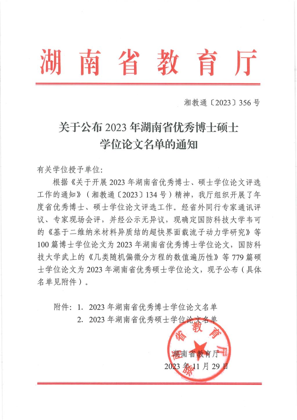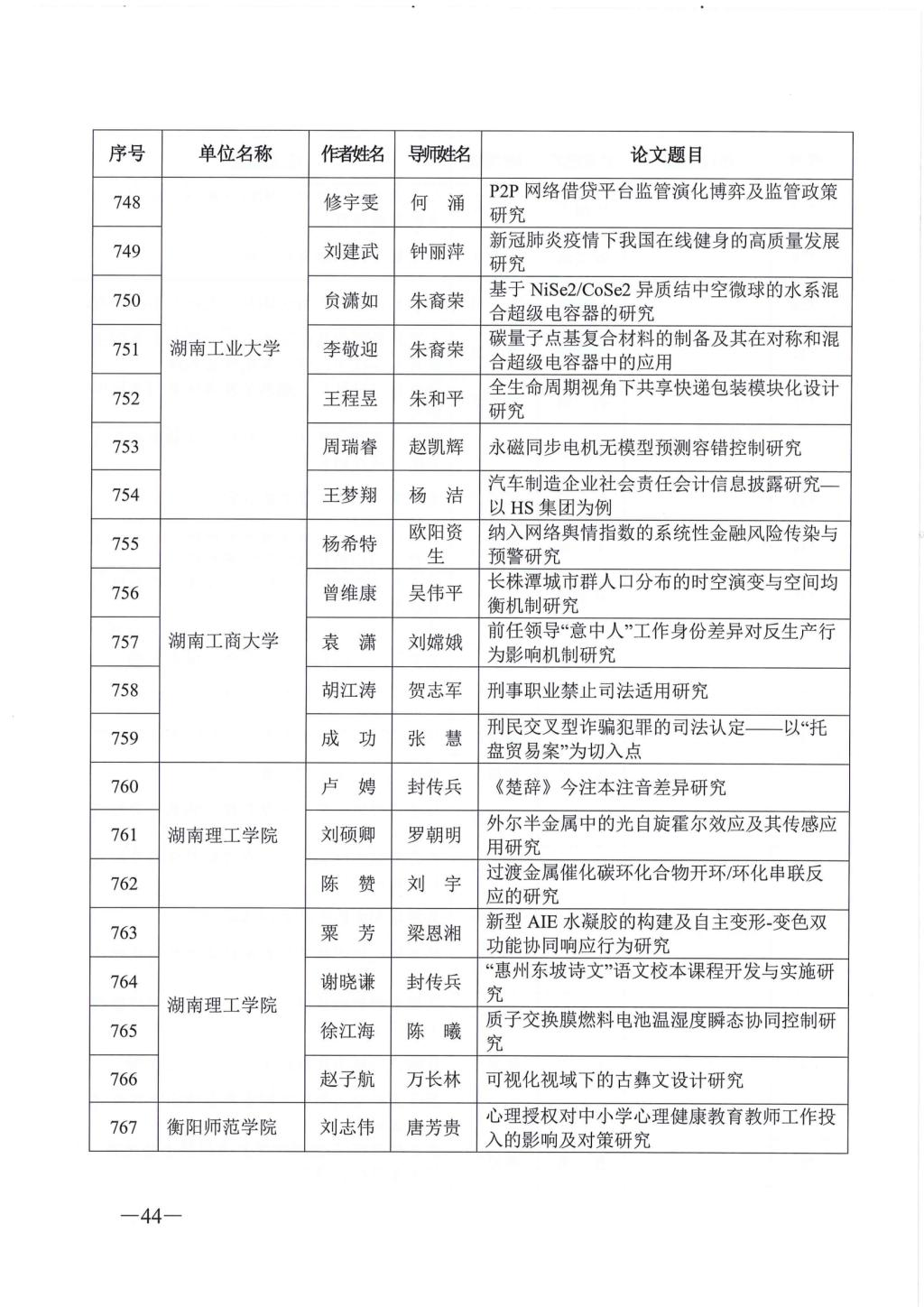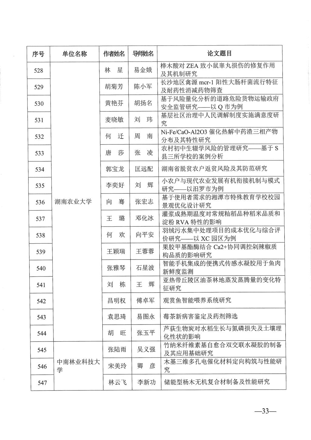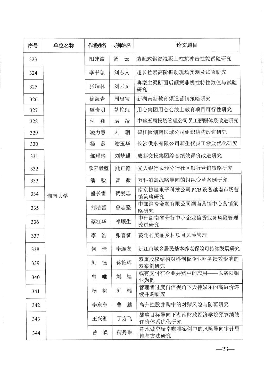 关于公布2023年湖南省优秀博士硕士学位论文名单通知