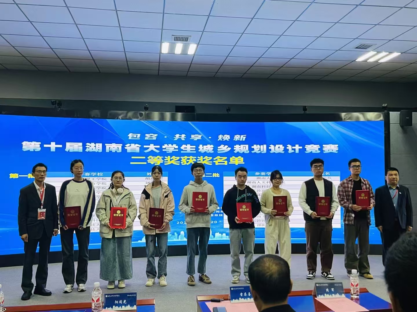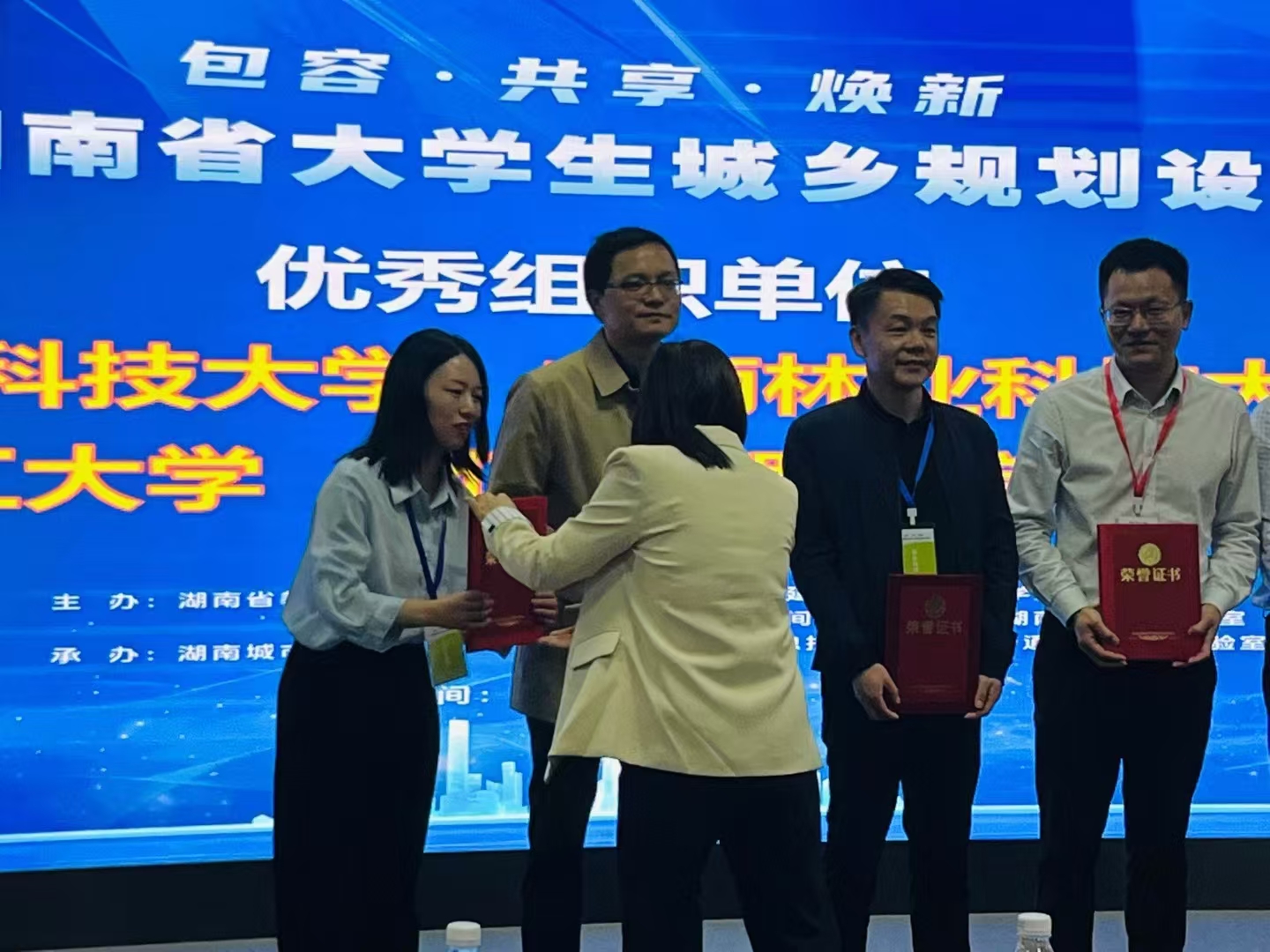 第十届湖南省大学生城乡规划设计竞赛以“包容·共享·焕新”为主题,围绕“某城市旧城区全龄友好住区设计”,在6个半小时内进行规划快题设计,旨在考查选手对整体规划、空间布局、交通组织、环境营造、建筑细节等方面的专业知识把控能力。我院在本次竞赛中共派出学生14人,其中城乡规划专业夏小湘、夏思盈、王颢钦同学获得一等奖,刘一磊、颜子超、刘瑶函、黎欣同学获得二等奖,江琪同学获得三等奖。此外,建筑学院再次获得“优秀组织单位奖”,同时一等奖获得者夏小湘同学作为第十届湖南省大学生城乡规划设计竞赛获奖学生代表在颁奖仪式上发言。