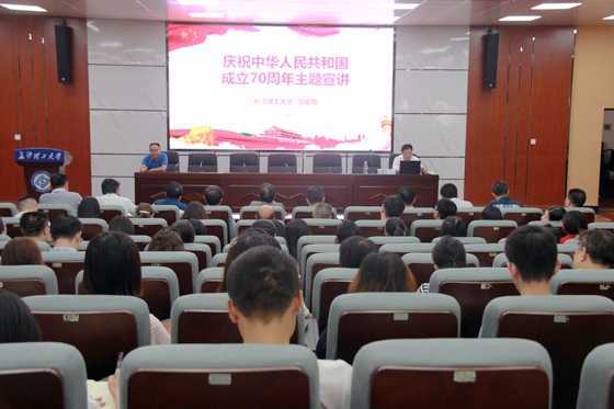 为深入推进“不忘初心、牢记使命”主题教育开展,庆祝中华人民共和国成立 70 周年,9月24日下午,校党委副书记邹宏如到金盆岭校区四教报告厅作《庆祝中华人民共和国成立70周年》主题宣讲。建筑学院、城南学院以及继续教育学院的全体教职工聆听宣讲。宣讲会由城南学院党委书记黄自力主持。
