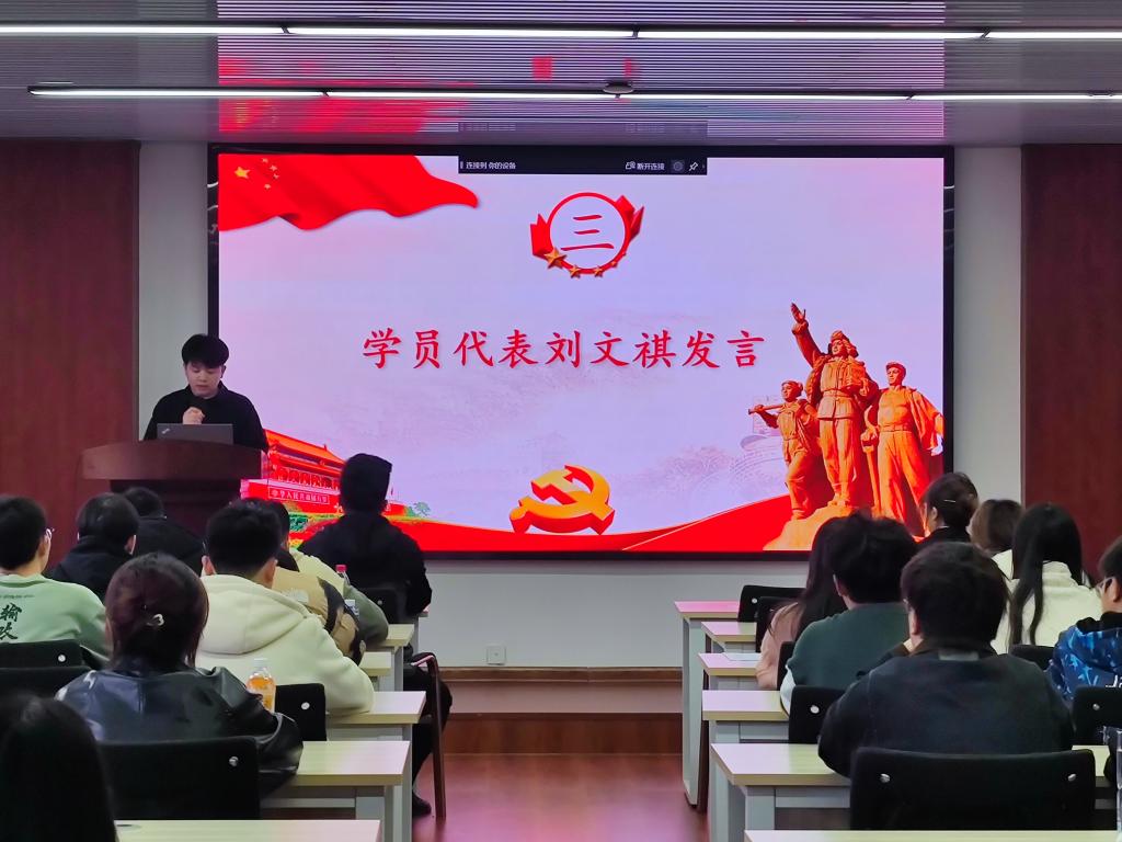 随后,2021级研究生学员代表刘文祺同学进行发言。刘文祺在发言中表示,要想成为一名优秀的共产党员,需要各位学员在学习和实践中不断加强党性修养,从思想上行动上进一步向党组织靠拢。在今后的学习工作中,学员们应该时刻以党员标准严格要求自己,听从党的教诲,遵守党的章程,加强党性修养,提高政治素养,接受党组织的教育考察,在思想上行动上与党中央保持高度一致,为党的事业贡献青春力量。