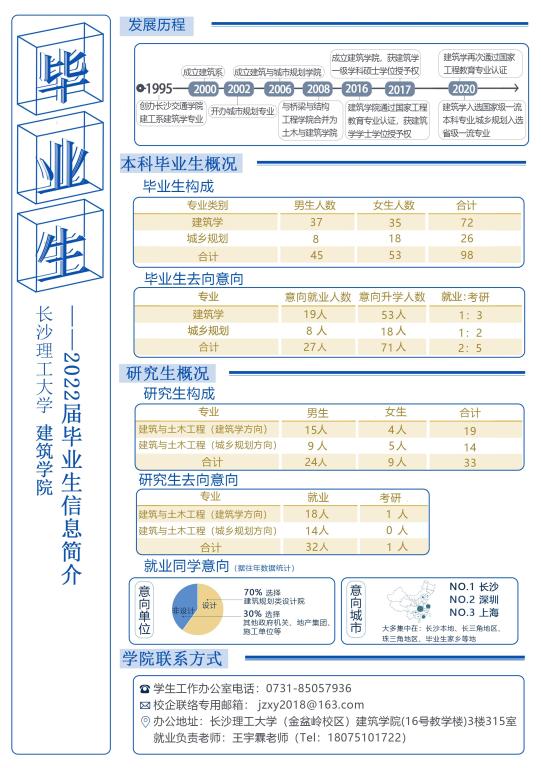 目前建筑学院 2022届毕业本科生共有 98 人,其中建筑学专业 72 人,城乡规划专业 26 人,毕业研究生共有 33人,其中建筑学方向19 人,城乡规划方向 14 人(毕业生信息详见附件一)。为使我院毕业生与用人单位达成良好的沟通,配合贵单位做好 2022届毕业生接收工作,我院兹定于 2021 年 10月 12日——10月 29日举办威廉体育williamhill建筑学院 2021年秋季专场招聘会。诚挚邀请贵单位光临指导!