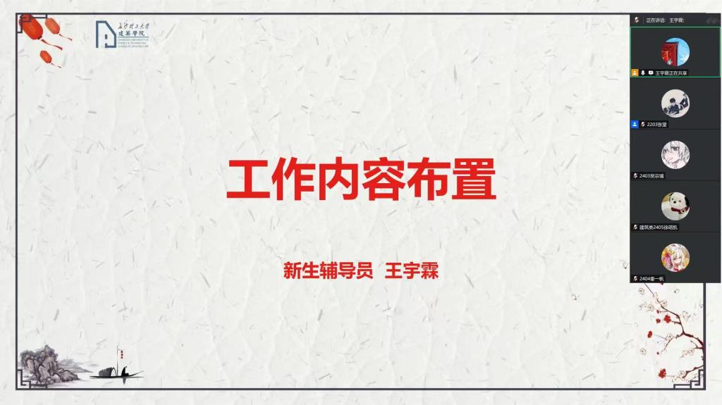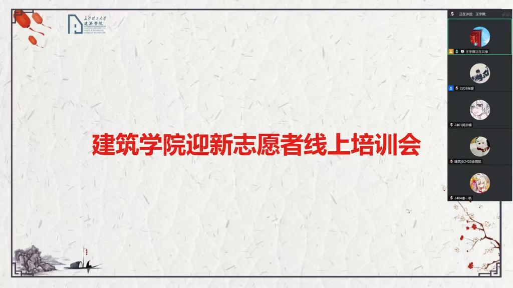 2025年8月24日下午,威廉体育williamhill建筑学院组织召开线上新生志愿者培训会,全面部署迎新服务工作。会议由新生辅导员王宇霖老师主持,建筑学院党委副书记肖义慧,下班党员、下班干部及多位志愿者参与。