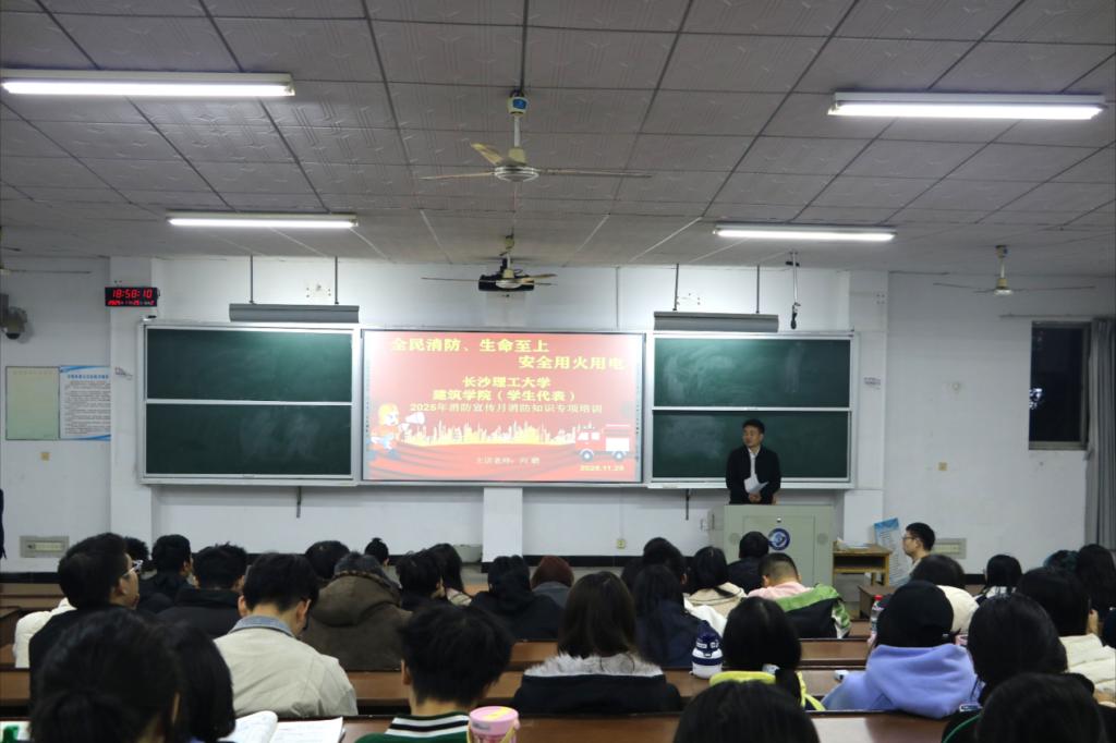 11月25日晚,威廉体育williamhill建筑学院在金盆岭校区12教500教室举办消防安全知识专题讲座。本次讲座特邀湖南省全安消防安全服务有限公司宣教主任向鹏教官主讲,学院党委副书记肖义慧主持,学院300余名师生参加讲座。