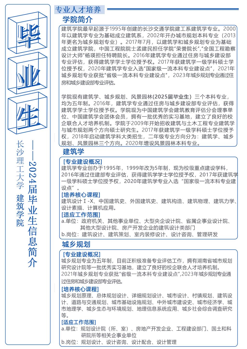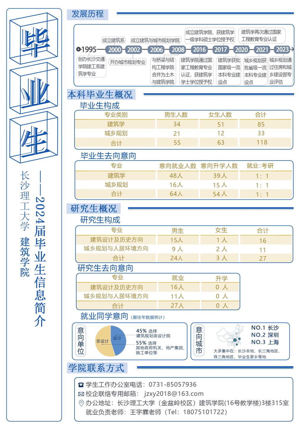目前建筑学院 2024届本科生共有 118 人,其中建筑学专业 85 人,城乡规划专业 33 人。2024届研究生共有 27 人,其中建筑设计及历史方向16 人,城乡规划与人居环境方向 11 人(毕业生信息详见《附件一》)。为使学院毕业生与用人单位达成良好的沟通,配合贵单位做好 2024 届毕业生接收工作,学院兹定于 2023 年 9 月 4日——11月 24 日举办威廉体育williamhill建筑学院2023年秋季招聘会。诚挚邀请贵单位光临指导!