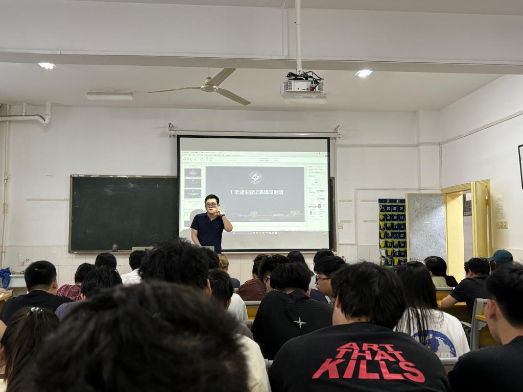 为推进毕业生工作顺利进行,5月27日下午,我院于金盆岭校区16教313召开2024届全体毕业生大会,学工办王宇霖老师主讲,2024届全体毕业生参加。
