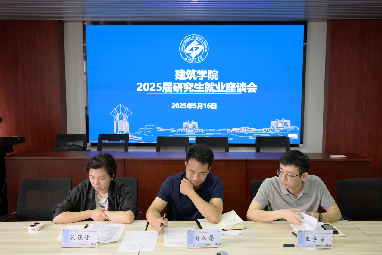 为扎实推进2025届毕业生就业工作,深入了解学生就业情况与实际困难,提供精准就业指导。5月16日,建筑学院在金盆岭校区16教314召开2025届研究生毕业生就业座谈会。学院党委副书记肖义慧、副院长吴荻子、研究生辅导员王宇霖以及未就业的研究生毕业生参加了此次会议,会议由王宇霖老师主持。