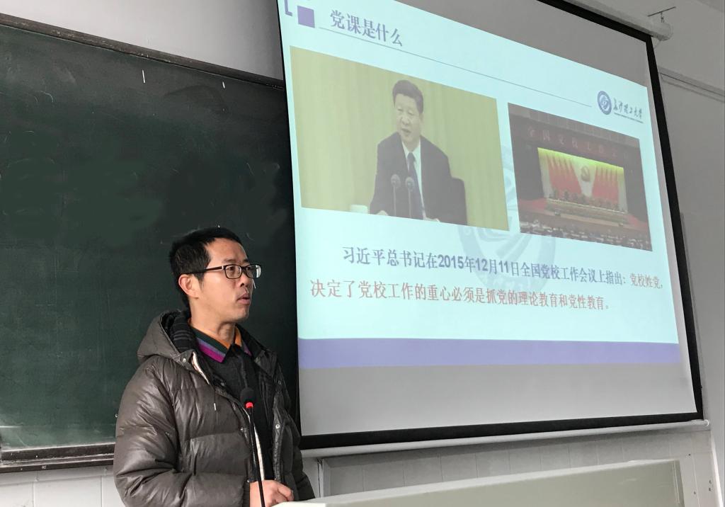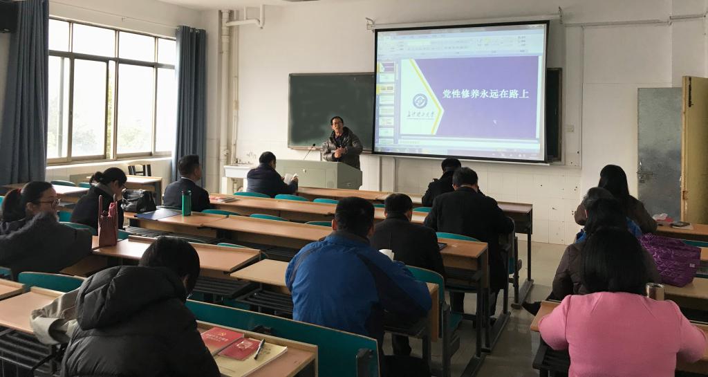 2018年1月2日上午,建筑学院分党委为深入学习党的十九大精神,在金盆岭16号教学楼308上了一期党课,党课的主题是“党性修养永远在路上”,由分党委书记丁力主讲,全体教师党员参加了此次党课。