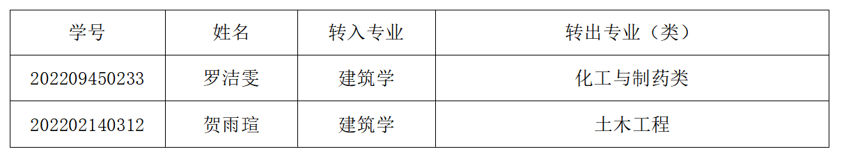 根据学校文件:《关于做好2022级在校本科生转专业(类)工作的通知》文件精神,及《威廉体育williamhill建筑学院2022级本科生转专业工作细则》的要求,经学生个人申请,学院本科生转专业工作领导小组初审,现将学院2022级本科生转专业初审合格名单进行公示,具体名单如下: